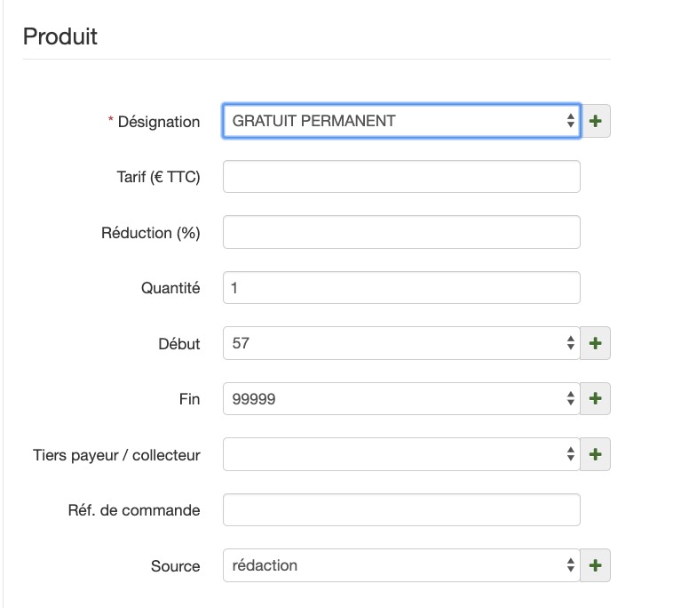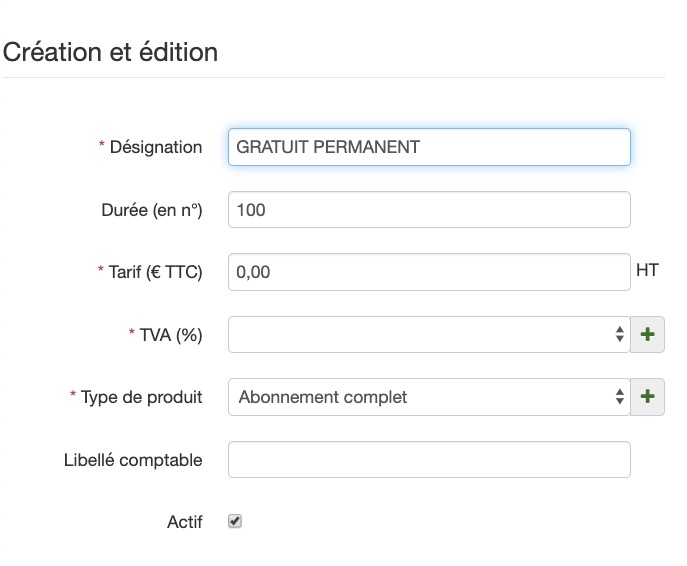 Pour cela, nous recommandons de créer un produit GRATUIT PERMANENT et d'insérer un nombre de parutions très large. Le tout avec un montant à 0 euro.